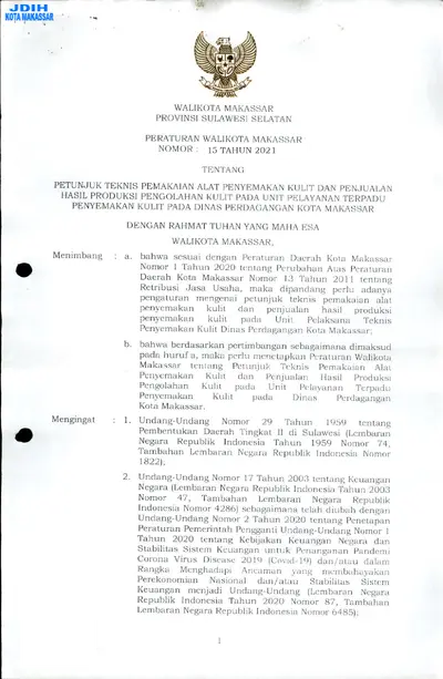 Peraturan Walikota Makassar Nomor 15 Tahun 2021 Tentang Petunjuk Teknis Pemakaian Alat Penyemakan Kulit Dan Penjualan Hasil Produksi Pengolahan Kulit .............