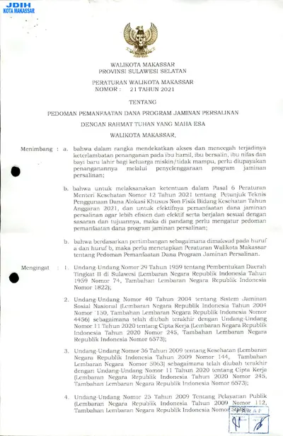 Peraturan Walikota Makassar Nomor 21 Tahun 2021 Tentang Pedoman Pemanfaatan Dana Program Jaminan Persalinan