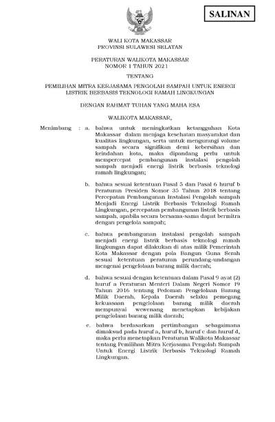 Peraturan Walikota Makassar Nomor 1 Tahun 2021 Tentang Pemilihan Mitira Kerjasama Pengolah Sampah Untuk Energi Listrik Berbasis Teknologi Ramah .............