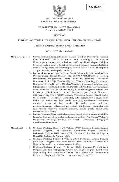 Peraturan Walikota Makassar Nomor 2 Tahun 2021 Tentang Peninjauan Tarif Retribusi Pengujian Kendaraan Bermotor