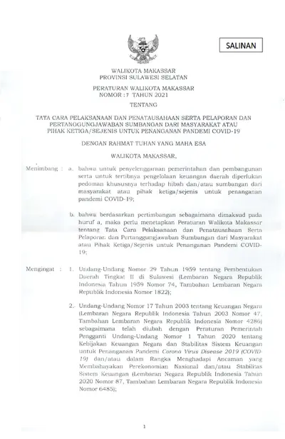 Peraturan Walikota Makassar Nomor 7 Tahun 2021 Tata Cara Pelaksanaan Dan Penatausahaan Serta Pelaporan Dan Pertanggungjawaban Sumbangan Dari .............