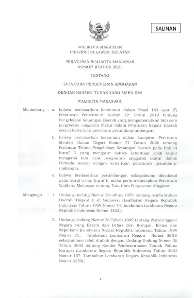Peraturan Walikota Makassar Nomor 8 Tahun 2021 Tentang Tata Cara Pergeseran Anggaran