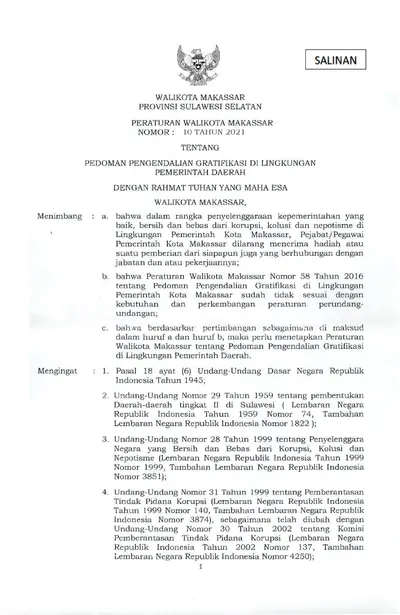 Peraturan Walikota Makassar Nomor 10 Tahun 2021 Tentang Pedoman Pengendalian Gratifikasi Di Lingkungan Pemerintah Daerah
