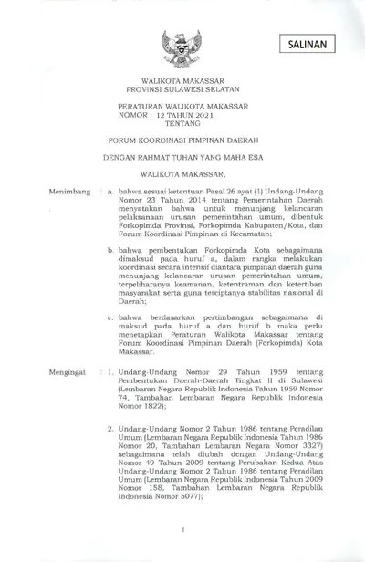 Peraturan Walikota Makassar Nomor 12 Tahun 2021 Tentang Forum Koordinasi Pimpinan Daerah