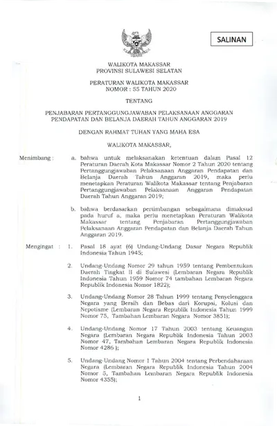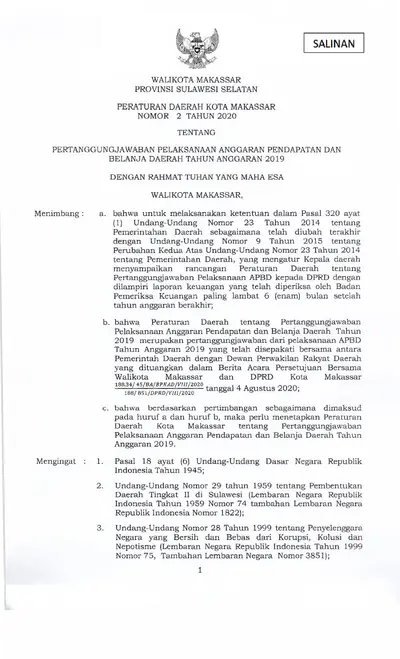 Peraturan Daerah Kota Makassar Nomor 2 Tahun 2020 Tentang Pertanggungjawaban Pelaksanaan Anggaran Pendapatan Dan Belanja Daerah Tahun Anggaran 2019