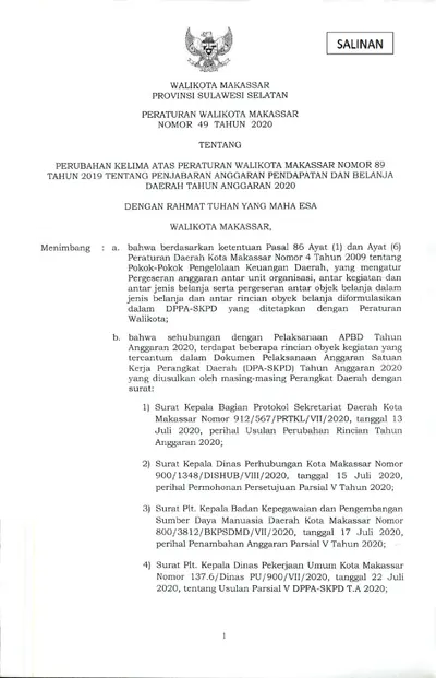 Peraturan Walikota Makassar Nomor 49 Tahun 2020 Tentang Perubahan Kelima Atas Peraturan Walikota Makassar Nomor 89 Tahun 2019 Tentang Penjabaran .............