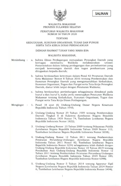Peraturan Walikota Makassar Nomor 50 Tahun 2020 Tentang Kedudukan, Susunan Organisasi, Tugas Dan Fungsi Serta Tata Kerja Dinas Perdagangan