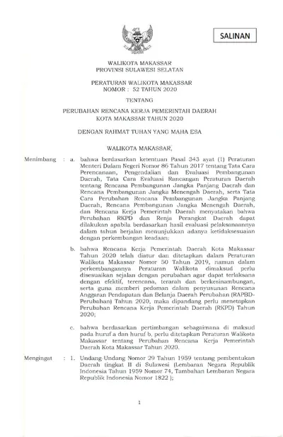 Peraturan Walikota Makassar Nomor 52 Tahun 2020 Tentang Perubahan Rencana Kerja Pemerintah Daerah Kota Makassar Tahun 2020