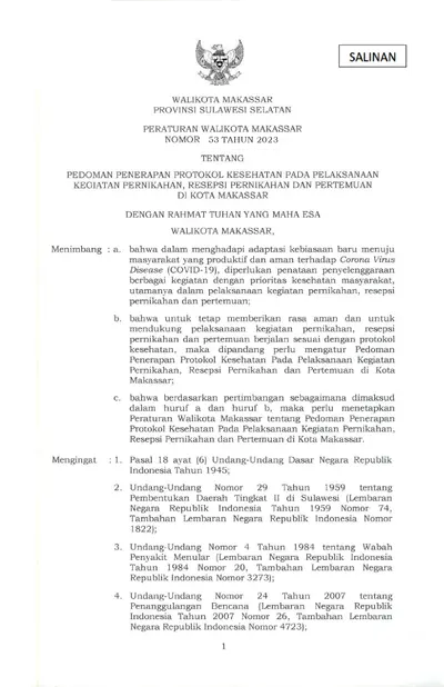 Peraturan Walikota Makassar Nomor 53 Tahun 2020 Pedoman Penerapan Protokol Kesehatan Pada Pelaksanaan Kegiatan Pernikahan, Resepsi Pernikahan Dan .............