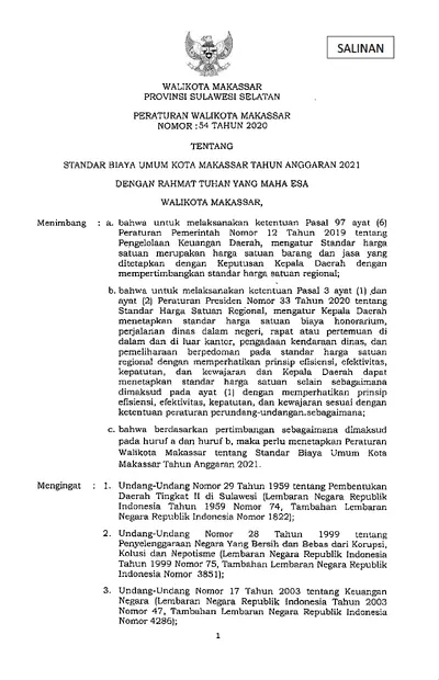 Peraturan Walikota Makassar Nomor 54 Tahun 2020 Tentang Standar Biaya Umum Kota Makassar Tahun Anggaran 2021