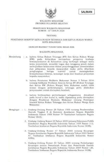 Peraturan Walikota Makassar Nomor 57 Tahun 2020 Tentang Penetapan Insentif Ketua Rukun Tetangga Dan Ketua Rukun Warga Kota Makassar