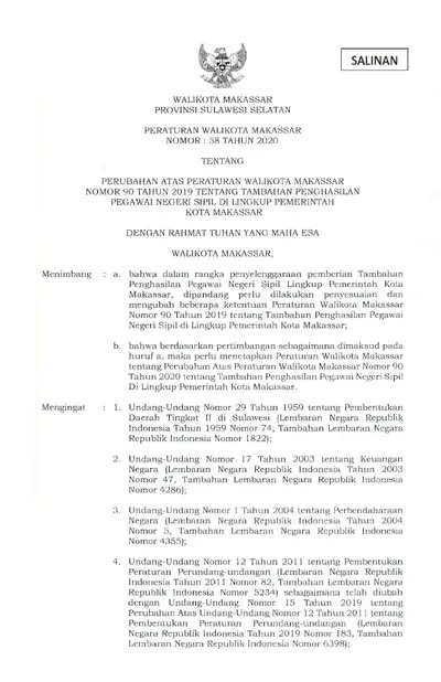 Peraturan Walikota Makassar Nomor 58 Tahun 2020 Tentang Perubahan Atas Peraturan Walikota Makassar Nomor 90 Tahun 2019 Tentang Tambahan Penghasilan .............