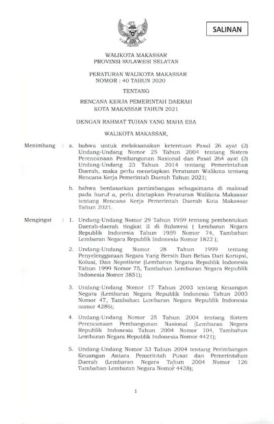 Peraturan Walikota Makassar Nomor 40 Tahun 2020 Tentang Rencana Kerja Pemerintah Daerah Kota Makassar Tahun 2021
