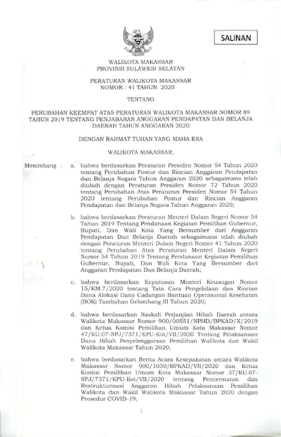 Peraturan Walikota Makassar Nomor 41 Tahun 2020 Tentang Perubahan Keempat Atas Peraturan Walikota Makassar Nomor 89 Tahun 2019 Tentang Penjabaran .............