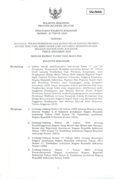 Peraturan Walikota Makassar Nomor 43 Tahun 2020 Tentang Petunjuk Teknis Pemberian Gaji Ketiga Belas Kepada Pegawai Negeri Sipil Yang Bersumber Dari .............
