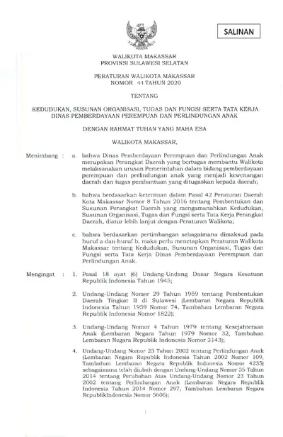 Peraturan Walikota Makassar Nomor 44 Tahun 2020 Tentang Kedudukan, Susunan Organisasi, Tugas Dan Fungsi Serta Tata Kerja Dinas Pemberdayaan Perempuan .............