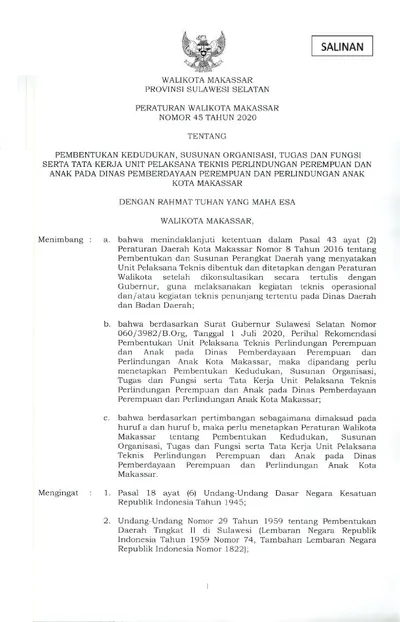 Peraturan Walikota Makassar Nomor 45 Tahun 2020 Tentang Pembentukan Kedudukan, Susunan Organisasi, Tugas Dan Fungsi Serta Tata Kerja Unit Pelaksana .............