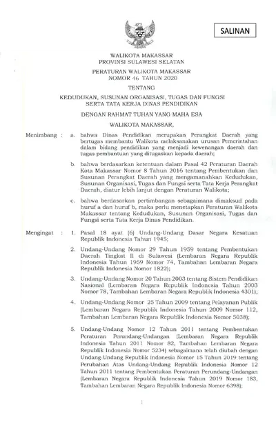 Peraturan Walikota Makassar Nomor 46 Tahun 2020 Tentang Kedudukan, Susunan Organisasi, Tugas Dan Fungsi Serta Tata Kerja Dinas Pendidikan