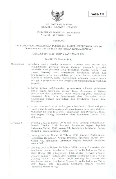 Peraturan Walikota Makassar Nomor 47 Tahun 2020 Tentang Tata Cara Pengawasan Dan Pemberian Surat Keterangan Bidang Peternakan Dan Kesehatan Hewan .............