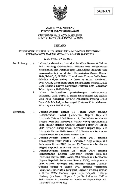 Keputusan Walikota Makassar Nomor 1657/188.4.45/Tahun 2025 Tentang Penetapan Peserta Didik Baru Sekolah Rakyat Menengah Pertama Kota Makassar Tahun .............