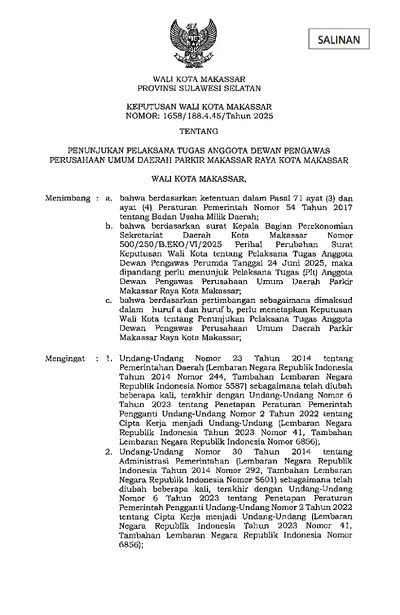 Keputusan Walikota Makassar Nomor 1658/188.4.45/Tahun 2025 Tentang Penunjukan Pelaksana Tugas Anggota Dewan Pengawas Perusahaan Umum Daerah Parkir .............