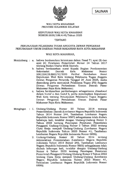 Keputusan Walikota Makassar Nomor 1659/188.4.45/Tahun 2025 Tentang Penunjukan Pelaksana Tugas Anggota Dewan Pengawas Perusahaan Umum Daerah Pasar .............