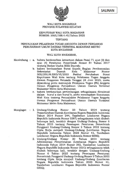 Keputusan Walikota Makassar Nomor 1660/188.4.45/Tahun 2025 Tentang Penunjukan Pelaksana Tugas Anggota Dewan Pengawas Perusahaan Umum Daerah Terminal .............