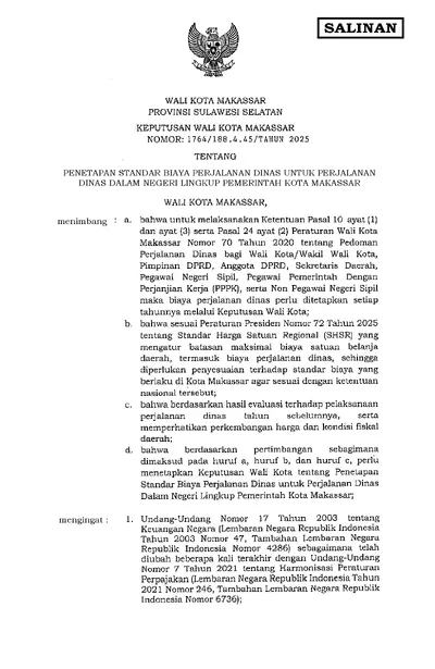 Keputusan Wali Kota Makassar Nomor 1764 Tahun 2025 Tentang Penetapan Standar Biaya Perjalanan Dinas Untuk Perjalanan Dinas Dalam Negeri Lingkup .............