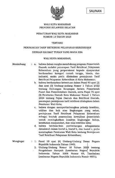 Peraturan Walikota Makassar Nomor 13 Tahun 2025 Tentang Peninjauan Tarif Retribusi Pelayanan Kebersihan