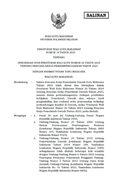 Peraturan Walikota Makassar Nomor 14 Tahun 2025 Tentang Perubahan Atas Peraturan Wali Kota Nomor 26 Tahun 2024 Tentang Rencana Kerja Pemerintah .............