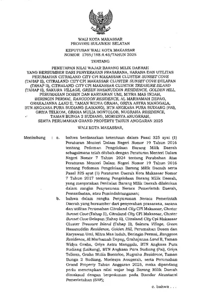 Keputusan Walikota Makassar Nomor 1769 Tahun 2025 Tentang Penetapan Nilai Wajar Barang Milik Daerah Yang Bersumber Dari Penyerahan Prasarana, Sarana .............