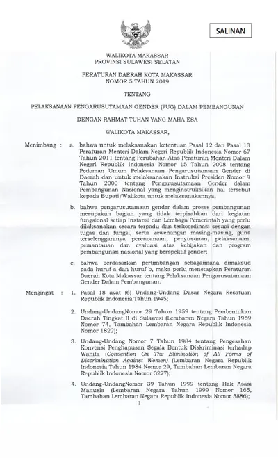 Peraturan Daerah Kota Makassar Nomor 5 Tahun 2019 Tentang Pelaksanaan Pengarusutamaan Gender (PUG) Dalam Pembangunan
