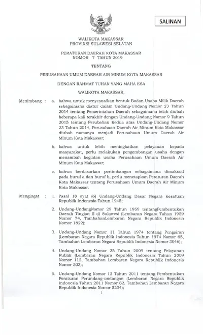Peraturan Daerah Kota Makassar Nomor 7 Tahun 2019 Tentang Perusahaan Umum Daerah Air Minum Kota Makassar
