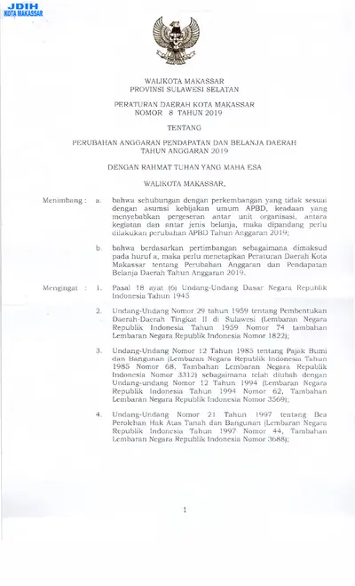 Peraturan Daerah Kota Makassar Nomor 8 Tahun 2019 Tentang Perubahan Anggaran Pendapatan Dan Belanja Daerah Tahun Anggaran 2019
