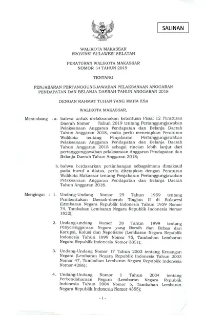 Peraturan Walikota Makassar Nomor 54 Tahun 2019 Tentang Penjabaran Pertanggungjawaban Pelaksanaan Anggaran Pendapatan Dan Belanja Daerah Tahun .............
