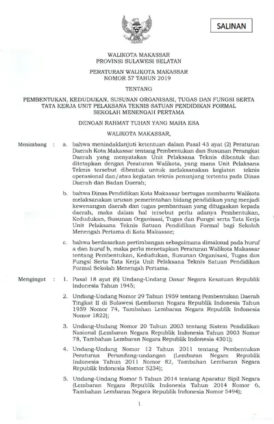 Peraturan Walikota Makassar Nomor 57 Tahun 2019 Tentang Pembentukan, Kedudukan, Susunan Organisasi, Tugas Dan Fungsi Serta Tata Kerja Unit Pelaksana .............