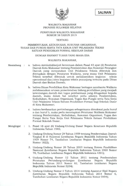 Peraturan Walikota Makassar Nomor 58 Tahun 2019 Pembentukan Kedudukan, Susunan Organisasi, Tugas Dan Fungsi Serta Tata Kerja Unit Pelaksana Teknis .............