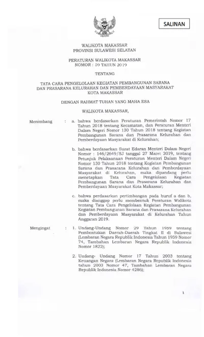 Peraturan Walikota Makassar Nomor 59 Tahun 2019 Tentang Tata Cara Pengelolaan Kegiatan Pembangunan Sarana Dan Prasarana Kelurahan Dan Pemberdayaan .............