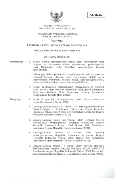 Peraturan Walikota Makassar Nomor 61 Tahun 2019 Tentang Pemberian Penghargaan Kepada Masyarakat