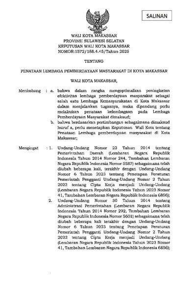 Keputusan Walikota Makassar Nomor 1572/188.4.45/Tahun 2025 Tentang Penataan Lembaga Pemberdayaan Masyarakat Di Kota Makassar