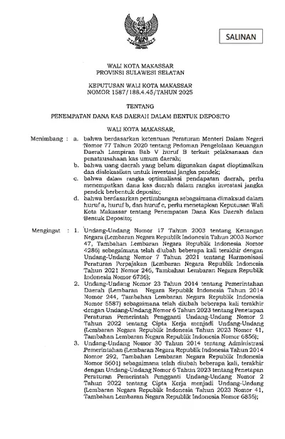 Keputusan Walikota Makassar Nomor 1587/188.4.45/Tahun 2025 Tentang Penempatan Dana Kas Daerah Dalam Bentuk Deposito