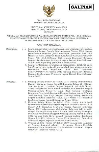 Keputusan Walikota Makassar Nomor 1614 Tahun 2025 Tentang Perubahan Atas Keputusan Wali Kota Makassar Nomor:700/ 188.4.45/tahun 2025 Tentang .............