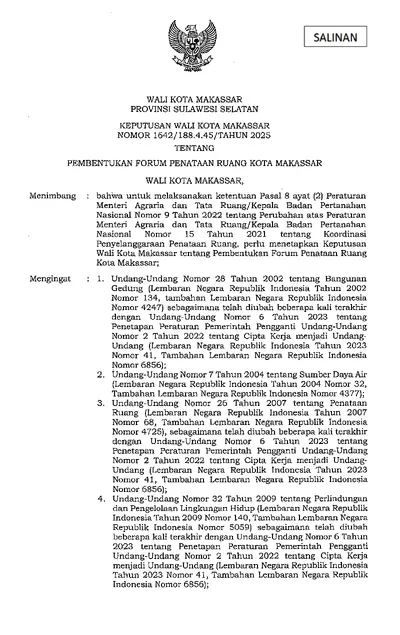 Keputusan Walikota Makassar Nomor 1642/188.4.45/Tahun 2025 Tentang Pembentukan Forum Penataan Ruang Kota Makassar