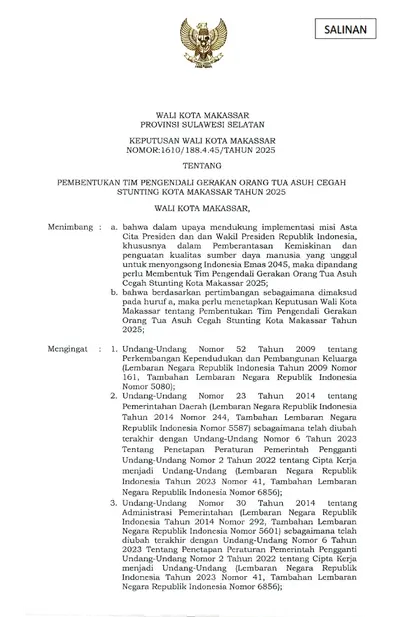 Keputusan Wali Kota Makassar Nomor 1610 Tahun 2025 Tentang Pembentukan Tim Pengendali Gerakan Orang Tua Asuh Cegah Stunting Kota Makassar Tahun 2025