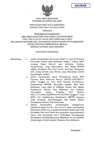 Keputusan Wali Kota Makassar Nomor 1628 Tahun 2025 Tentang Pemberian Pembebasan Bea Perolehan Hak Atas Tanah Dan Bangunan Yang Terletak Di Jalan Urip .............