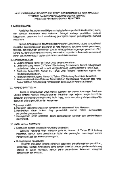 Hasil Kajian Badan Pembentukan Peraturan Daerah Dprd Kota Makassar Terhadap Rancangan Peraturan Daerah Tentang Fasilitasi Penyelenggaraan Pesantren