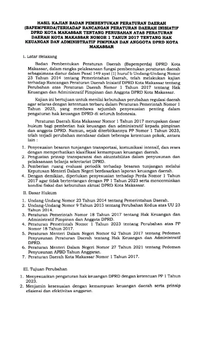 Hasil Kajian Badan Pembentukan Peraturan Daerah (Bapemperda)terhadap Rancangan Peraturan Daerah Inisiatif Dprd Kota Makassar Tentang Perubahan Atas .............
