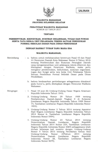Peraturan Walikota Makassar Nomor 53 Tahun 2017 Tentang Pembentukan, Kedudukan, Susunan Organisasi, Tugas Dan Fungsi Serta Tata Kerja Unit Pelaksana .............