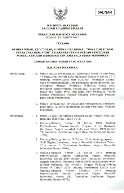 Peraturan Walikota Makassar Nomor 54 Tahun 2017 Tentang Pembentukan, Kedudukan, Susunan Organisasi, Tugas Dan Fungsi Serta Tata Kerja Unit Pelaksana .............