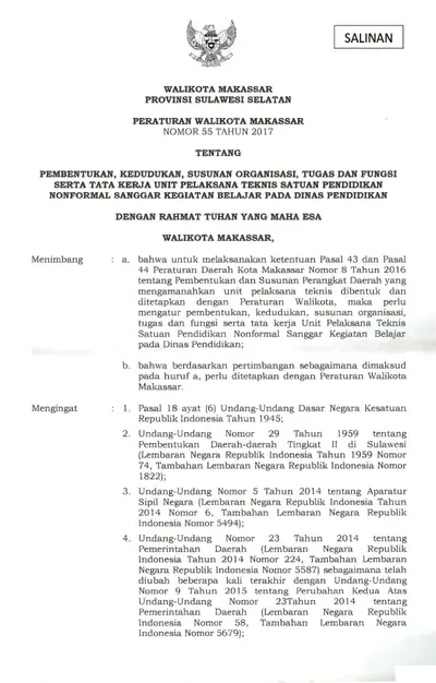 Peraturan Walikota Makassar Nomor 55 Tahun 2017 Tentang Pembentukan, Kedudukan, Susunan Organisasi, Tugas Dan Fungsi Serta Tata Kerja Unit Pelaksana .............